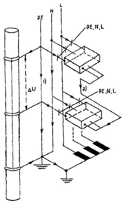 Для уравнивания потенциалов защищаемые PEN-проводником металлические части электроустановок соединяют эквипотенциальными связями с доступными одновременному прикосновению СПЧ, в том числе металлическими и железобетонными конструкциями зданий и сооружений. В этом случае четвертая жила кабеля системы TN-C, выполняющая функцию PEN-проводника, оказывается зашунтированной СПЧ, в том числе металлическими и железобетонными строительными конструкциями, которые, таким образом, становятся одной из параллельных цепей PEN-проводника. Такое положение наблюдается во всех современных электроустановках вопреки требованию п. 543.2.5. При этом, как показали экспериментальные исследования, проведенные ВНИИПроектэлектромонтажом совместно с трестом «Татэлектромонтаж», в случае к.з. потенциал защищаемого оборудования не превышает предельно допустимого безопасного значения 6 В и одновременно существенно возрастает значение тока о.к.з., что повышает надежность защиты от к.з.