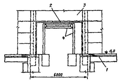 3. С увеличенной шириной пролета в верхнем этаже (по отношению к нижележащим), оборудованном мостовыми электрическими кранами общего назначения грузоподъемностью от 5 до 10 т, с расчетными нагрузками на балки (ригели) перекрытий от 110 до 265 кН/м |