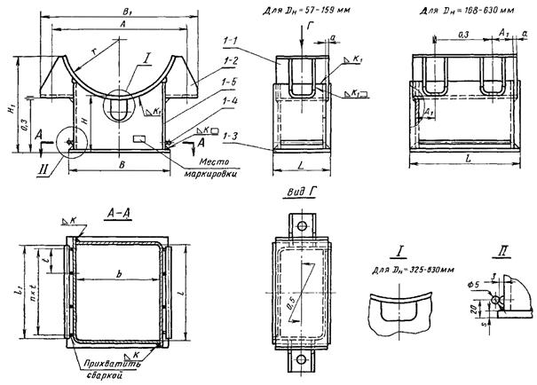 Опоры изготовляются пяти исполнений (в соответствии с температурой рабочей среды трубопровода) согласно табл. 1.