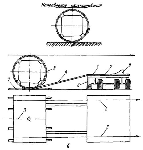 Погрузку рулонов на полуприцепы и прицепы-тяжеловозы для дальнейшей доставки к месту монтажа осуществляют кранами или накатыванием с помощью лебедок или тракторов (черт. 4, б).