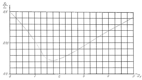 В первом приближении определяют среднюю глубину водоема и по величине I1 и графику рис. 3.2 находят безразмерную величину и Х0 - положение узловой точки на оси водоема. Величины Δh, рассчитанные от узловой точки в направлении действия ветра, принимают положительные значения (нагон), а в противоположном направлении - отрицательные значения (сгон). Начиная с Х0, водоем разбивают на отдельные участки таким образом, чтобы учесть изменение его глубины и конфигурации береговой линии. Безразмерные величины Δhi*/Hi получают с помощью графика рис. 3.1 по величине Х/L = 1 и величине