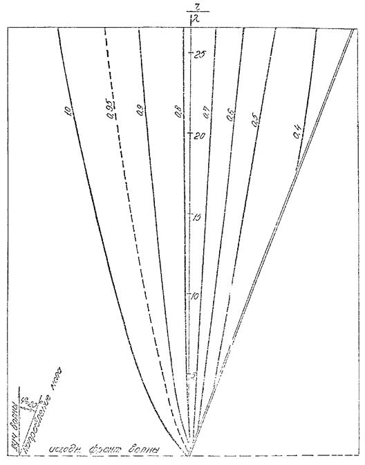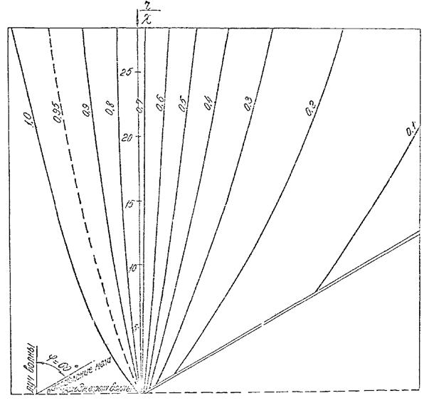 Затем измеряем расстояние В между границами волновой тени. Получаем В = 230 м. Наконец, по отношениям L/B = 5,6,  и углу φ = 75° с помощью графика на рис. 17 находим ψсх = 0,86 для точки Р1.