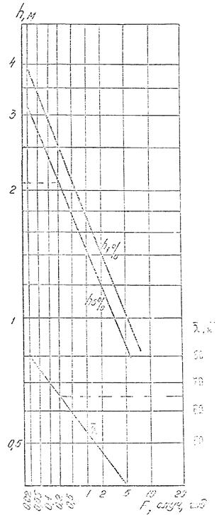 По нескольким значениям F с исходных режимных функций снимаем соответствующие , h1%, h5%. Например, для F = 0,2:  = 65 м, h1% = 2,5 м, h5% = 2,1 м. (см. рис. 3).