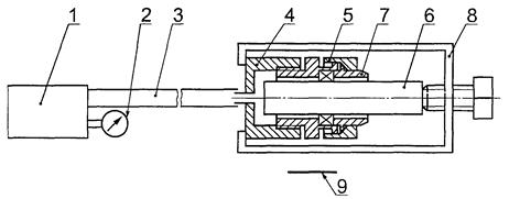 1 - стенд для гидравлических испытаний; 2 - устройство для создания давления воды (насос); 3- прибор для измерения давления; 4 - резиновая прокладка; 5 - испытуемая деталь; 6 - трубка для выхода воздуха при заполнении водой; 7 - струбцина для крепления испытуемой детали к стенду; 8 - трубка для предварительного заполнения оболочки водой