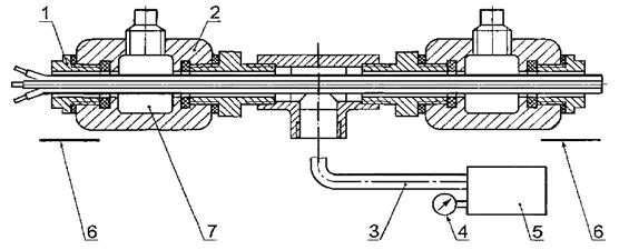 В испытуемую оболочку помещают эластичную камеру, выполненную из резины толщиной до 0,5 мм. Эластичную камеру присоединяют к штуцеру. При этом обеспечивают герметичность всей системы.