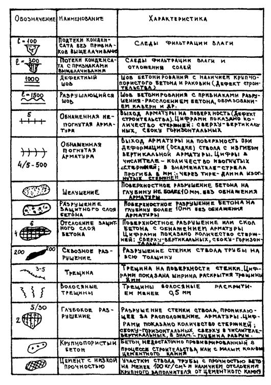 3.4. Повреждения от температурно-влажностных воздействий проявляются в образовании системы вертикальных, а в верхней части железобетонных дымовых труб, и горизонтальных трещин, в отслоениях кирпича и бетона лещадками преимущественно в местах применения материалов невысокой морозостойкости и их чрезмерного увлажнения атмосферными осадками, выбросами пара, технических вод и др. Степень повреждения конструкций характеризуется шириной раскрытия и длиной трещин, площадью деструктивных разрушений конструкций фундамента, ствола, футеровки.