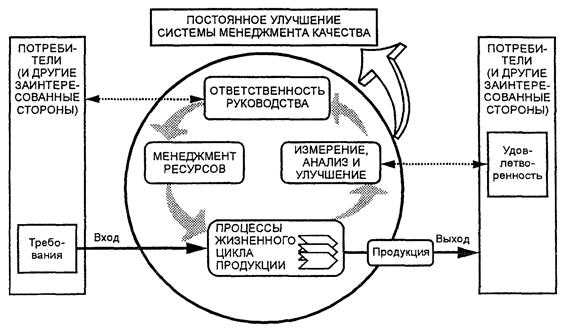 На рисунке 1 приведена основанная на процессном подходе система менеджмента качества, описанная в семействе стандартов ИСО 9000. Он показывает, что заинтересованные стороны играют существенную роль в предоставлении организации входных данных. Наблюдение за удовлетворенностью заинтересованных сторон требует оценки информации, касающейся восприятия заинтересованными сторонами степени выполнения их потребностей и ожиданий. Модель, приведенная на рисунке 1, не показывает процессы на детальном уровне.