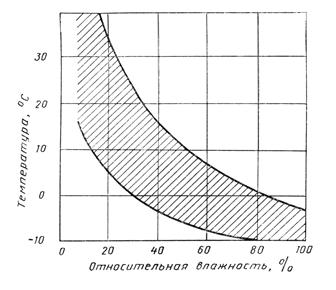 2.4. Измерения не проводят во время осадков, при скорости ветра более 5 м/с, а также при неблагоприятных сочетаниях температуры и относительной влажности окружающего воздуха, когда затухание звука в воздухе для третьоктавной полосы с центральной частотой 8 кГц превышает 10 дБ на 100 м. Зона неблагоприятных условий сочетания температуры и относительной влажности воздуха представлена на черт. 1 в виде заштрихованного участка.