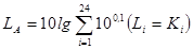 2.4.4. После внесения в данные по шуму ВСУ всех поправок получают скорректированные усредненные уровни звукового давления в двадцати четырех третьоктавных полосах частот от 50 до 10000 Гц, которые используют для вычисления уровня звука, создаваемого ВСУ в каждой контрольной точке, на каждом режиме испытаний по формуле