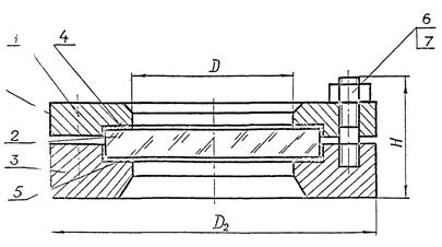 1 - фланец D - АТК 24.201.10-90; 2-стакан D- АТК 24.201.10-90; 3 - бобышка 1-D - АТК 24.201.10-90; 4 - прокладка 1-d×D АТК 24.201.10-90; 5, 6 - прокладка 1 (2)-d×D АТК 24.201.10-90; 7 - стекло; 8 - шпилька по ОСТ 26-2039; 9 - гайка по ОСТ 26-2038.