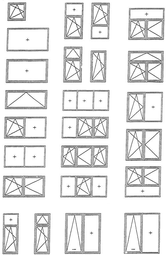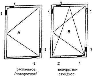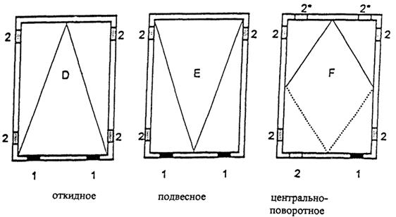 Конструкция изделий предусматривает распашное, подвесное, откидное и поворотно-откидное открывание створных элементов. Примеры схем конструкций изделий приведены в Приложении.
