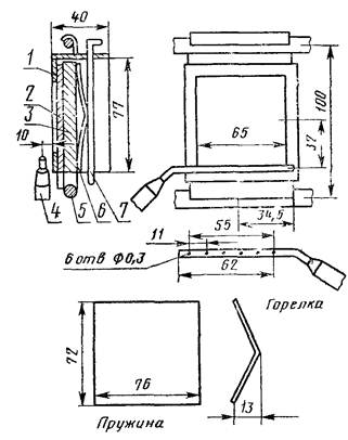 плиты толщиной 10 мм; 4 - горелка; 5 - опорные стержни; 6 - пружина