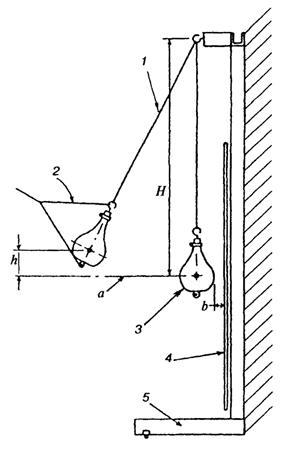 Удар производят по центру образца, мешок при этом описывает дугу, падая с высоты, указанной в таблице 6, двигаясь по направлению центральной горизонтальной оси поверхности образца. Удар по каждому образцу должен быть только один.