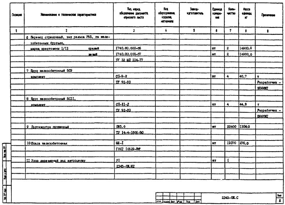 В группу «Элементы пути» включают оборудование, рельсы железнодорожные, рельсы контррельсовые, переводы стрелочные, брусья стрелочных переводов, шпалы, противоутоны, .устройства тормозные, упоры путевые, лотки междушпальные и др. изделия (устройства), предусмотренные рабочими чертежами. В Спецификацию не включают элементы рельсовых скреплений (болты, гайки, шайбы, костыли и др.).