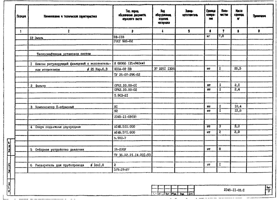 В раздел «Изделия и материалы» включают трубопроводную арматуру, в т. ч. клапаны регулирующие, закладные конструкции, опоры (крепления) трубопроводов и др. устройства, трубопроводы по каждому диаметру, конструкции теплоизоляционные, а также материалы, предусмотренные основным комплектом рабочих чертежей.