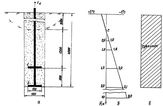 а - схема анкера; б - расчетная температура грунта; в - геологический разрез участка.