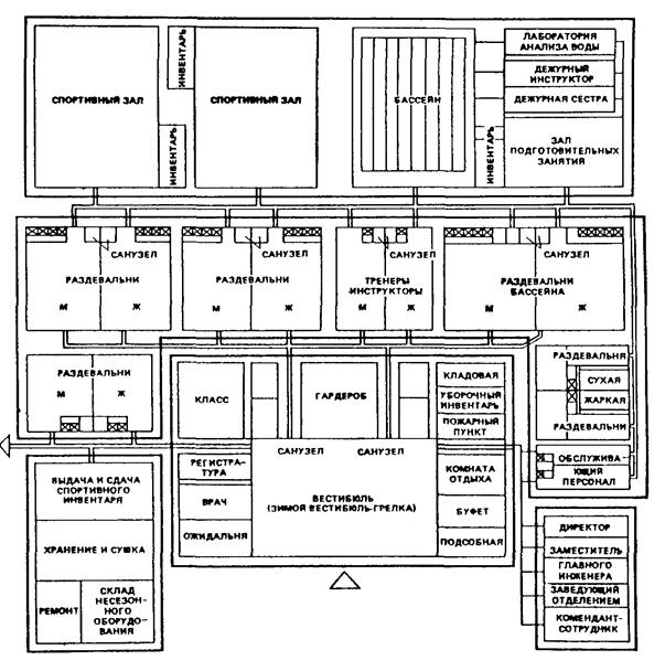 гардероб с вестибюлем, туалеты, душевые, курительные;