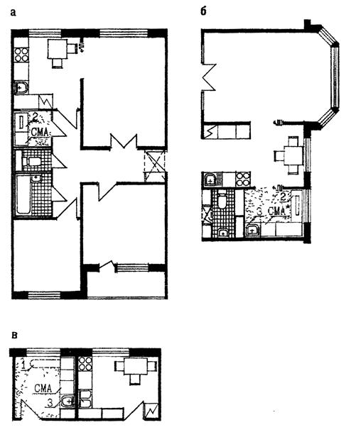 II - в жилом комплексе с обслуживанием и центром реабилитации для молодых инвалидов (МНИИТЭП, М2, стадия «проект». Архитекторы Дадья В., Полетаев Ю. и другие): в - 2-комнатная квартира; г - 3-комнатная квартира.