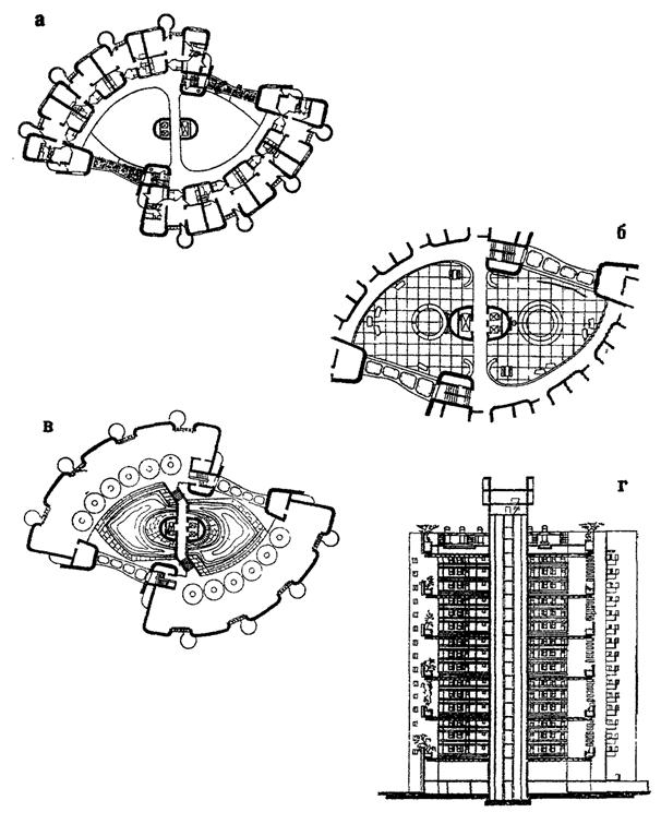 а - 22-этажной жилой дом. Германия, Бремен. Архитектор А. Аалто. План типового этажа;