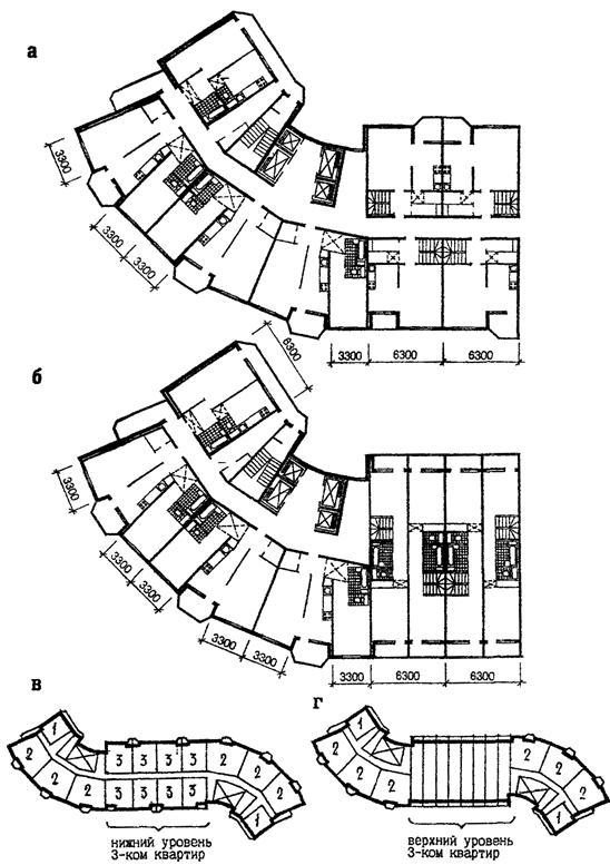 I - с односторонним размещением одно- и двухуровневых квартир вдоль общего коридора - 9-этажный жилой дом в Зеленограде (Моспроект-2. Архитекторы Покровский И. и Новиков Ф.): а - схема дома, б - планы двухуровневой 4-комнатной квартиры.