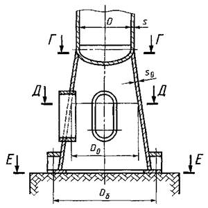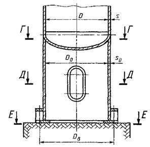 D0 - внутренний диаметр цилиндрической опорной обечайки (рисунок 2а) или внутренний диаметр конической опорной обечайки в соответствующем расчетном сечении (рисунок 2б), мм (см)