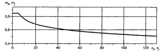 тk и mj - коэффициенты пульсации давления ветра для середины соответственно k-го участка на высоте хk и j-й площадки на высоте хj по рисунку 6 или формулам: