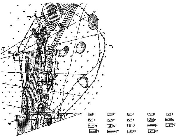 тектоническое строение месторождений, наличие зон крупных тектонических нарушений, зон дробления пород, простирание, падение и ширина разломов, характер и амплитуда смещений; трещиноватость пород, число и генезис трещин, характер заполнителя, закарстованность и кавернозность горных пород.