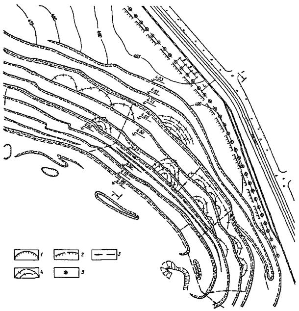 В случаях необходимости изучения условий залегания пород и зон трещиноватости следует предусматривать горные выработки - шахты, штольни, шурфы, прорези, расчистки.
