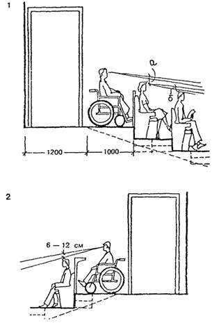 Зону отдыха для инвалидов необходимо размещать в стороне от транспорта и основного потока посетителей, в озелененном и тихом месте, в относительной близости от входа в кинотеатр, причем, желательно, с возможностью обзора входа.
