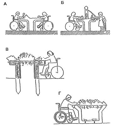 На территории, прилегающей к кинотеатру, целесообразно выделить зону отдыха для инвалидов, обеспеченную необходимым оборудованием и средствами дизайна. Специально запроектированная садово-парковая архитектура, малые формы, мебель, скамейки, кресла, навесы, перголы, беседки - все это может значительно обогатить в функциональном и эстетическом отношении внешнюю среду кинотеатра.