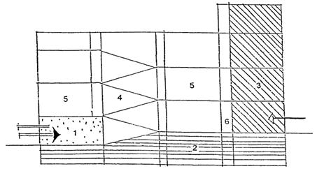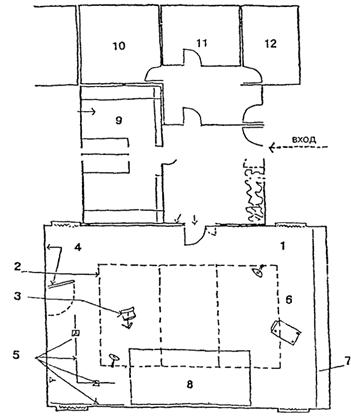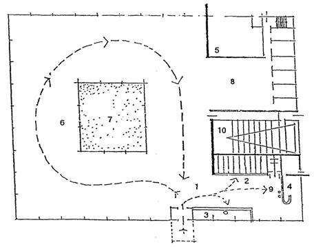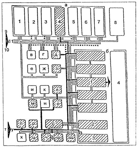 а - фондохранилище; 1 - приемная экспонатов; 2 - рабочее помещение; 3 - 7 - фондохранилище; 8 - техническое помещение; 9 - сотрудники; 10 - экспонаты; 11 - служебный вход; б - экспозиционная часть: 1 - постоянная экспозиция; 2 - временные выставки; 3 - зона отдыха; 4 - открытые экспозиции; в - дезинфекционная; г - фотолаборатория; д - реставрационная мастерская; е - склад музейного оборудования; ж, з - мастерские; и - канцелярия; к - комната общественных организаций; л - помощник научного сотрудника; м - библиотека; н - администрация; о - кружковая; п - касса; р - киоск; с - лекционный зал; т - посетители; у - главный вход, ф - контроль; х - охрана; ц - гардероб; ч - экскурсионное бюро; ш - курительная, туалет; щ - буфет