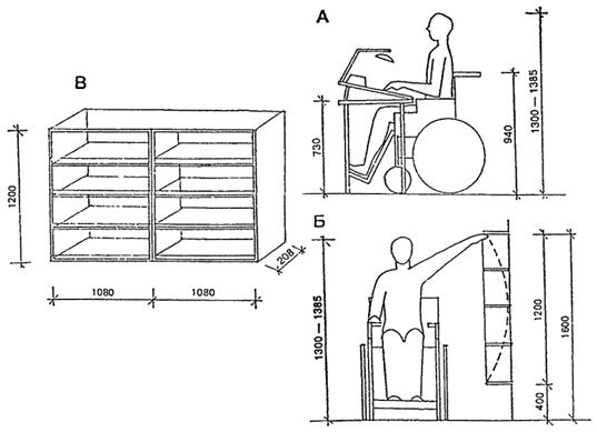 Витрины в экспозиционных залах, посещаемых инвалидами на колясках, при навесном варианте должны размещаться на высоте, доступной для визуального восприятия с коляски, а при горизонтальном размещении - иметь достаточное пространство для ног при подъезде на коляске вплотную.