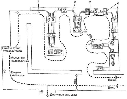 1 - обозначение направления движения; 2 - непрерывный поручень для рук между предметами; 3 - экспонаты на цоколе