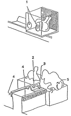 1 - удобный и безопасный ящик для ценных экспонатов с отверстиями для рук, чтобы «трогать»; 2 - крупный заголовок, расположенный под прямым углом к лучу зрения; 3 - надписи на брайлевском шрифте для горизонтального чтения; 4 - непрерывный деревянный поручень с округленными и хорошо обработанными краями (800 мм от пола); 5 - стрелки на цоколе для обозначения направления движения и мест поворотов