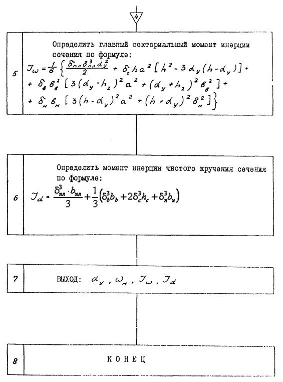 субалгоритма «СЕКТОР» определения положения центра изгиба сечения по вертикали - aу, секториальной координаты сечения по центральному нижнему волокну - wн, главного секториального момента инерции Jw, момента инерции чистого кручения Jd для тонкостенного стержня п-образного профиля.