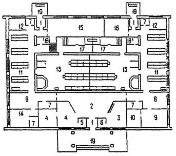 14 - склад обменного фонда одежды и обуви; 15 - гардероб