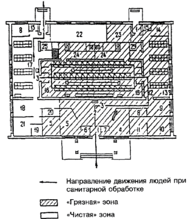 10 - санитарный пропускник; 11 - пост дозиметрического контроля;