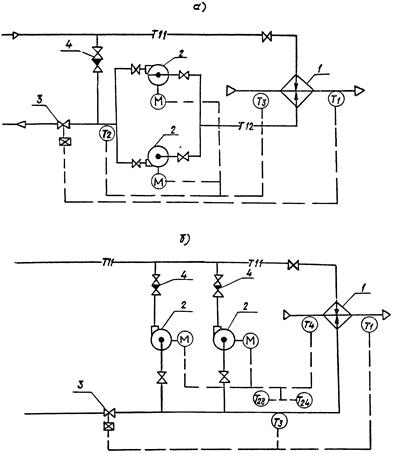 б - с установкой насоса на перемычке между подающим и обратным трубопроводами теплоносителя.