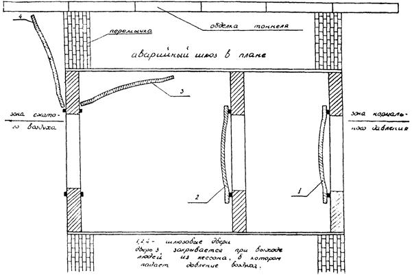 2.11. Аварийный шлюз не разрешается занимать чем-либо и внутренняя дверь его должна быть всегда открыта в сторону повышенного давления, чтобы в случае внезапной аварии в тоннеле (затопление, прорыв воздуха, пожар и т.п.) люди могли укрыться в нем и вышлюзоваться в нормальную зону (приложение 4).