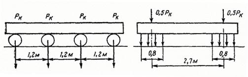 Грузоподъемность для тяжелой одиночной нагрузки принимают в виде массы эталонной четырехосной тележки с расстоянием между осями 1,2 м (рис. 2).