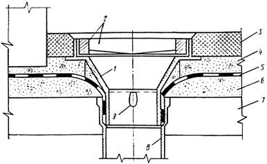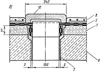Звено в уровне опирания на поддон заливают горячим битумом слоем 10 см или герметизируют с помощью упругих прокладок, обжимаемых специальными приспособлениями.