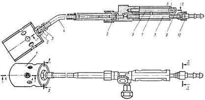 Пропан - бутановая смесь из баллона через регулятор давления ДПП-1-65 или РД.1-БМ и резиновый рукав с внутренним диаметром 9 мм (ГОСТ 9356-60, тип II) под давлением 0,01 - 0,05 МПа подводится к горелке. Основная часть пропана через ствольную трубку направляется в коллектор, в котором равномерно распределяется по форсункам дозирующими вставками нагревательных форсунок. Часть пропана от ствола отводится к запальнику.