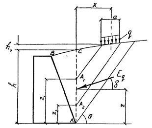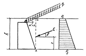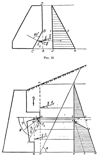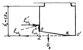 * Такой подход к определению коэффициента трения обеспечивает дополнительный запас устойчивости стены. Правильнее было бы построить эпюру нормальных давлений (напряжений) по площадке LO' и коэффициент трения определять как средневзвешенное значение, исходя не из размеров площадок LК и КО', а из площадей частей эпюры нормальных давлений, действующих по площадкам LK и КО'.