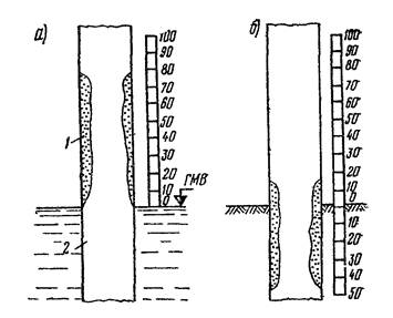 а) в воде; б) в грунте; 1 - зона гниения, 2 - увлажненная зона