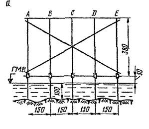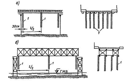 в сваях (стойках) - места сопряжения с насадками, места прикрепления схваток, места сроста стоек со сваями (рис. 3), в зоне колебаний горизонта воды (рис. 4, а), на суходоле - у поверхности земли (рис. 4, б);