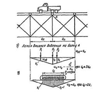 При двухполосном движении, когда на пролетном строении могут находиться одновременно два автомобиля, в формулы определения грузоподъемности ферм и сосредоточенных прогонов следует подставлять коэффициент поперечной установки, вычисленный для двух машин на мосту. При этом по ширине проезжей части автомобили должны быть установлены так, чтобы расстояние между бортами в свету оставалось не менее 10 см, а габариты машин не выступали за пределы проезжей части.
