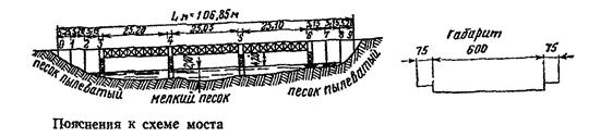 На схеме моста указывают: номера опор, считая по ходу километража дороги; длину моста по настилу; величины расчетных пролетов моста; расстояние от горизонта воды до низа пролетных строений; наибольшую глубину воды в реке; ширину реки в межень; грунт дна и берегов.