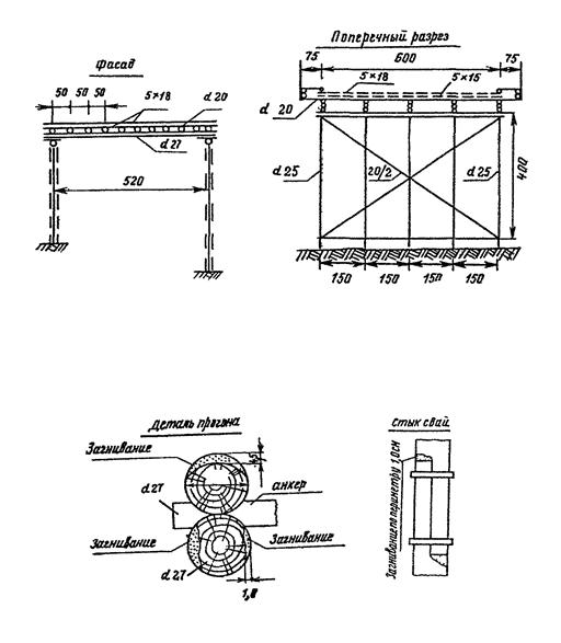в насадках - места опирания на них прогонов и сопряжения со сваями (стойками);