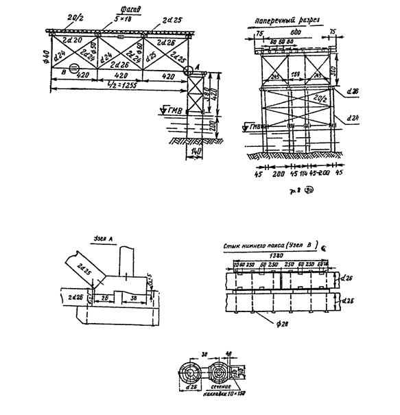 в) по главным фермам: конструкция ферм; расчетный пролет ферм; количество ферм в поперечном сечении моста; расстояния между осями ферм; расчетная высота ферм в середине пролета; сечение нижнего пояса ферм в середине пролета; количество и величина панелей; сечение верхнего пояса ферм в середине пролета; сечение раскосов; сечение тяжей в фермах Гау-Журавского; наличие связей.