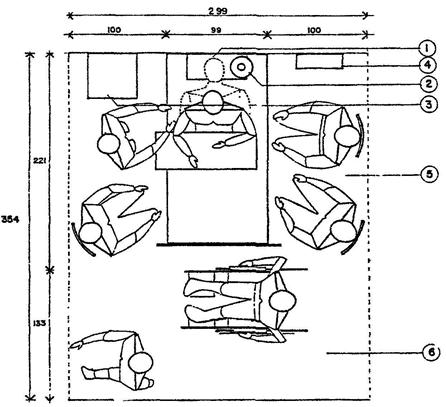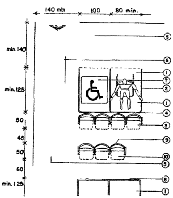 Специальные места либо секции предусматривать на каждые 100 мест. В небольших залах на 500 мест 60 мест следует проектировать только для использования инвалидами. В более вместительных залах число таких мест не может быть менее 200.